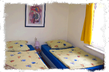 Im Wohnzimmer befindet sich eine Couch, ein Esstisch und 2 Einzelbetten.